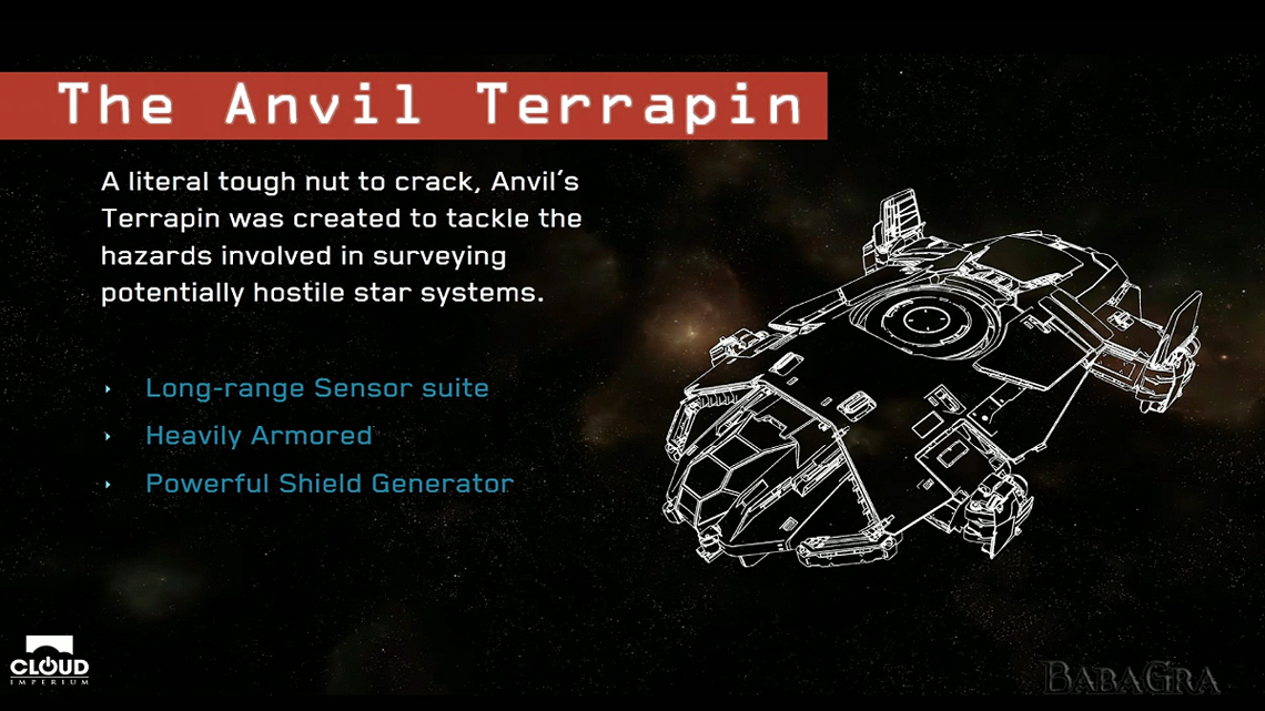 Oprócz tego ogłoszono sprzedaż kolejnego statku kosmicznego, a raczej konceptu, który kiedyś tam w przyszłości dodany zostanie do gry. Oczywiście dopiero po tym gdy dodane zostaną wszelkie inne ogłoszone i sprzedane wcześniej modele statków. Terrapin można zakupić jeszcze przez kilka dni w okazyjnej cenie 240$ lub też za jedyne 1100$ można nabyć pakiet eksploracyjny składający się z sześciu statków, w tym Terrapin.