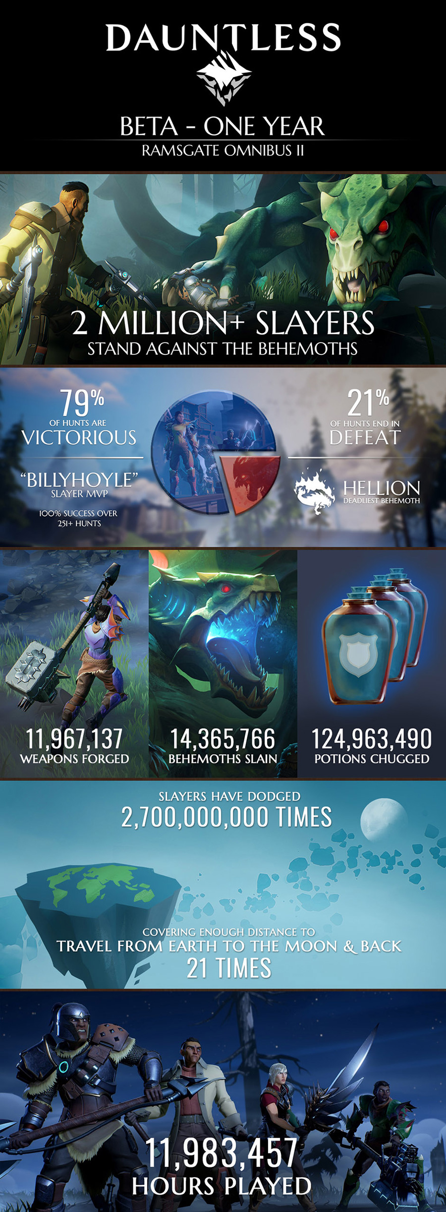 Najnowsza infografika opublikowana przez studio Phoenix Labs ujawnia nieco więcej szczegółów związanych z tym okresem. Zaprezentowane na niej liczby są naprawdę imponujące: ponad dwa miliony graczy zabiło ponad 14 milionów przeciwników, stworzyło prawie 12 milionów broni i użyło prawie 125 milionów eliksirów.